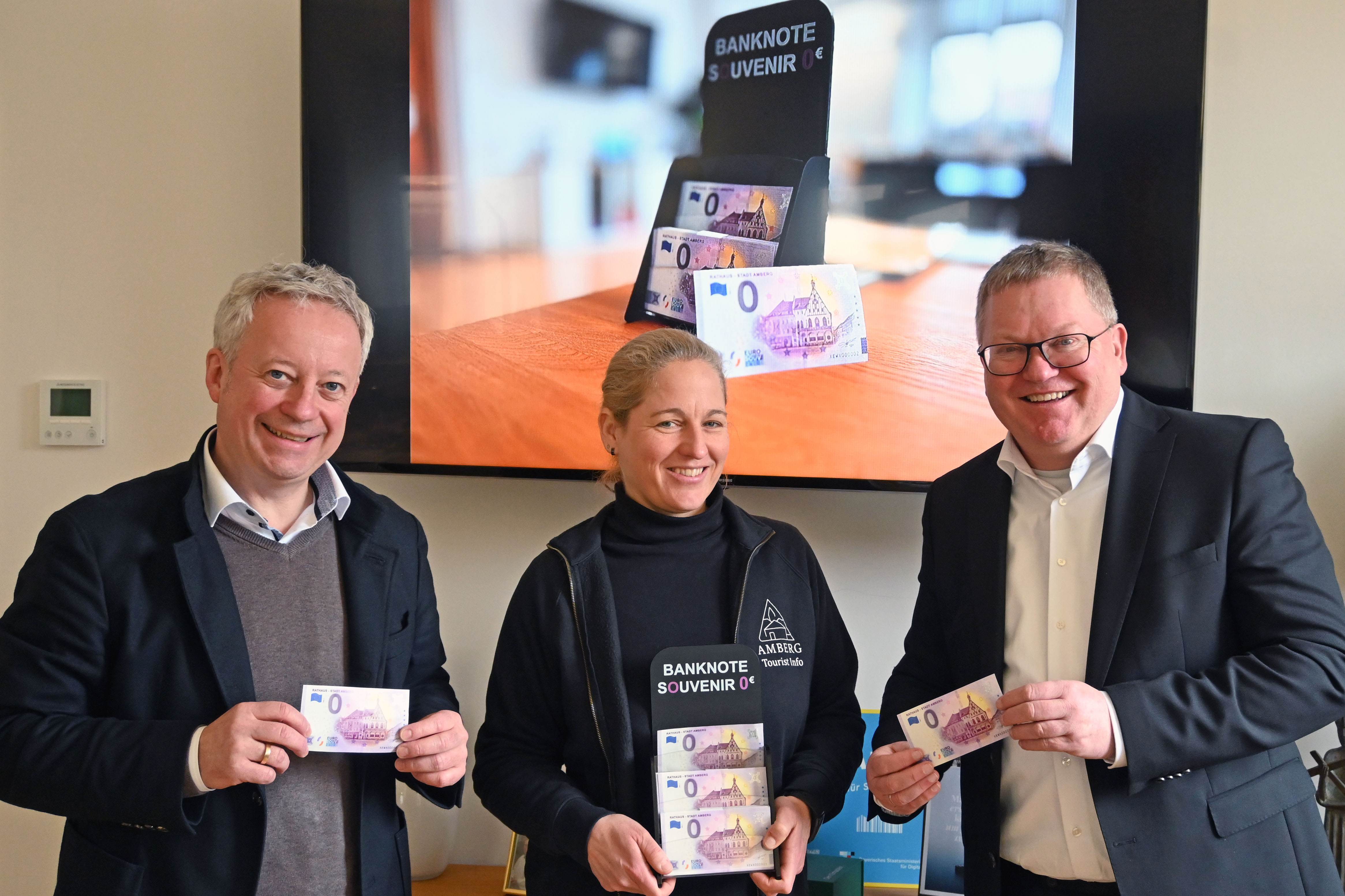 Die Leiterin des Amtes für Tourismusförderung Heike Kober sowie Kultur- und Tourismusreferent Dr. Fabian Kern überreichten jetzt Oberbürgermeister Michael Cerny das erste Exemplar der Serie, die in einer limitierten Kleinstauflage von 3.000 Stück hergestellt worden und in der Tourist Information Amberg erhältlich ist. Bei Abholung kostet der 0-Euro-Schein zwei Euro. Das Angebot gilt, solange der Vorrat reicht.
