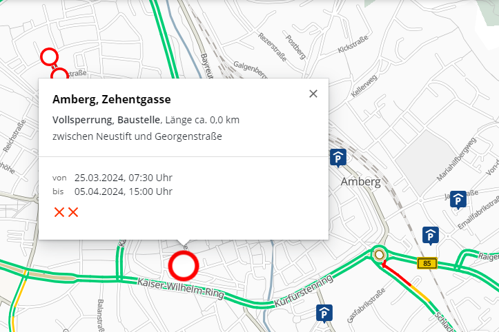Angezeigt werden im Plan nur die aktuellen Behinderungen. Zukünftige Sperrungen und Baustellen können in den Meldungen unterhalb der Karte oder über den Baustellenkalender auf https://www.bayerninfo.de/de/baustellenkalender nachgelesen werden.